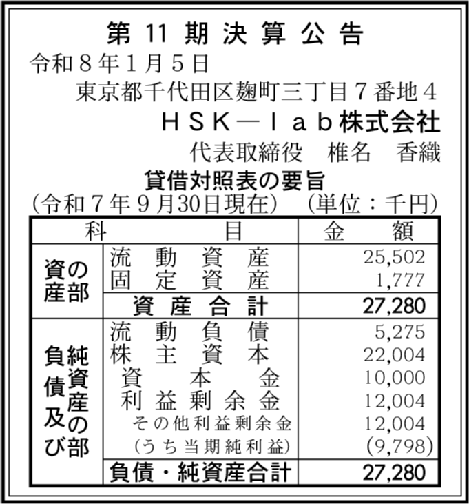 | 会社名 | HSK-lab株式会社 |