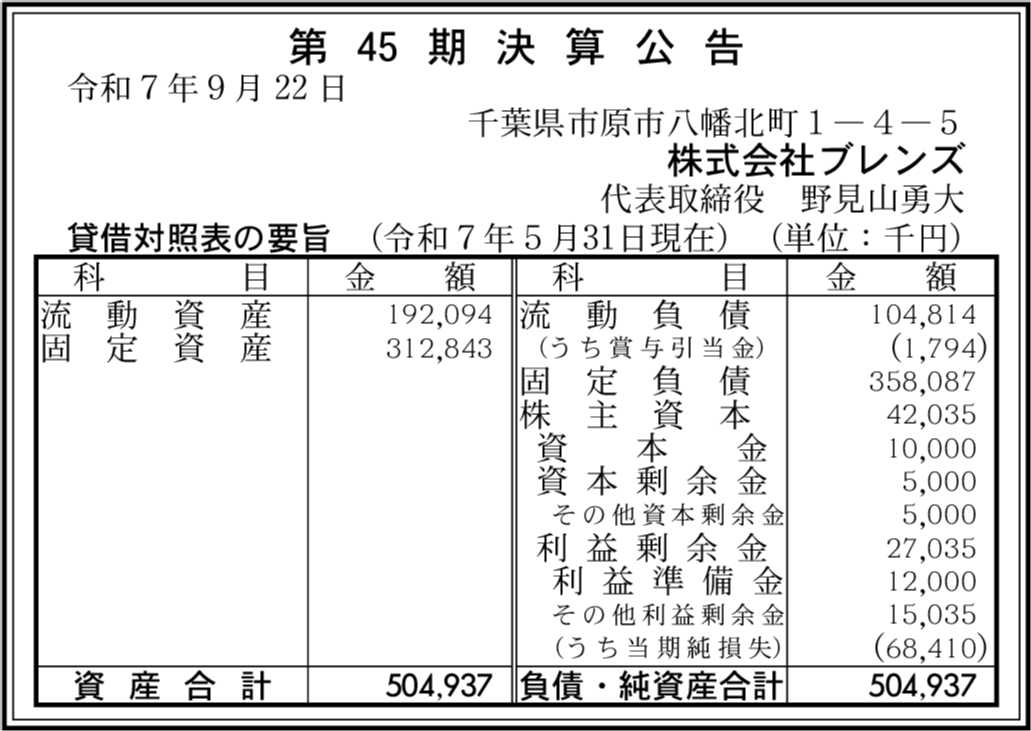 利益剰余金 | 2,703万5,000円 (▲71.68%) |