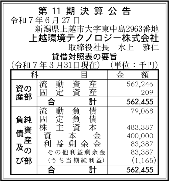 | 会社名 | 上越環境テクノロジー株式会社 |