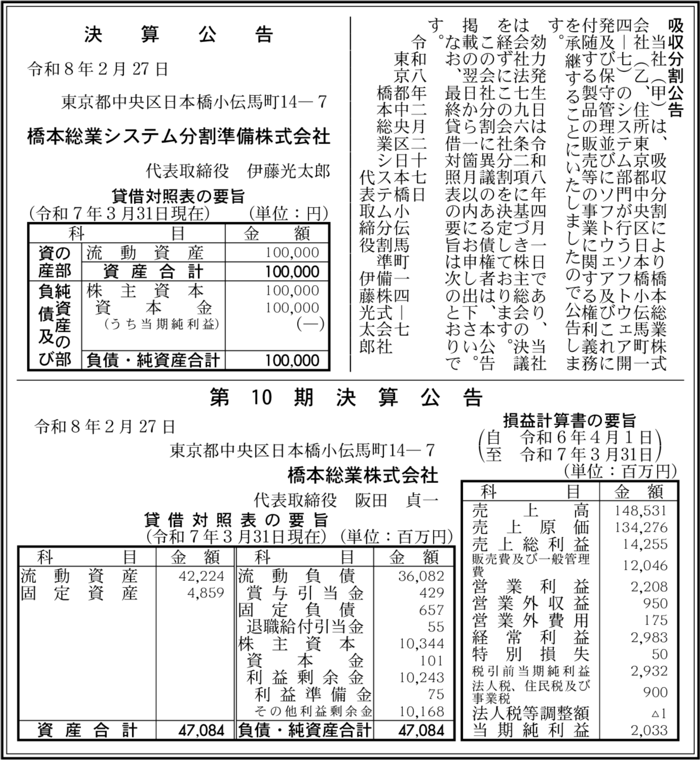 橋本総業システム分割準備株式会社 東京都中央区 【2025年3月期】 |