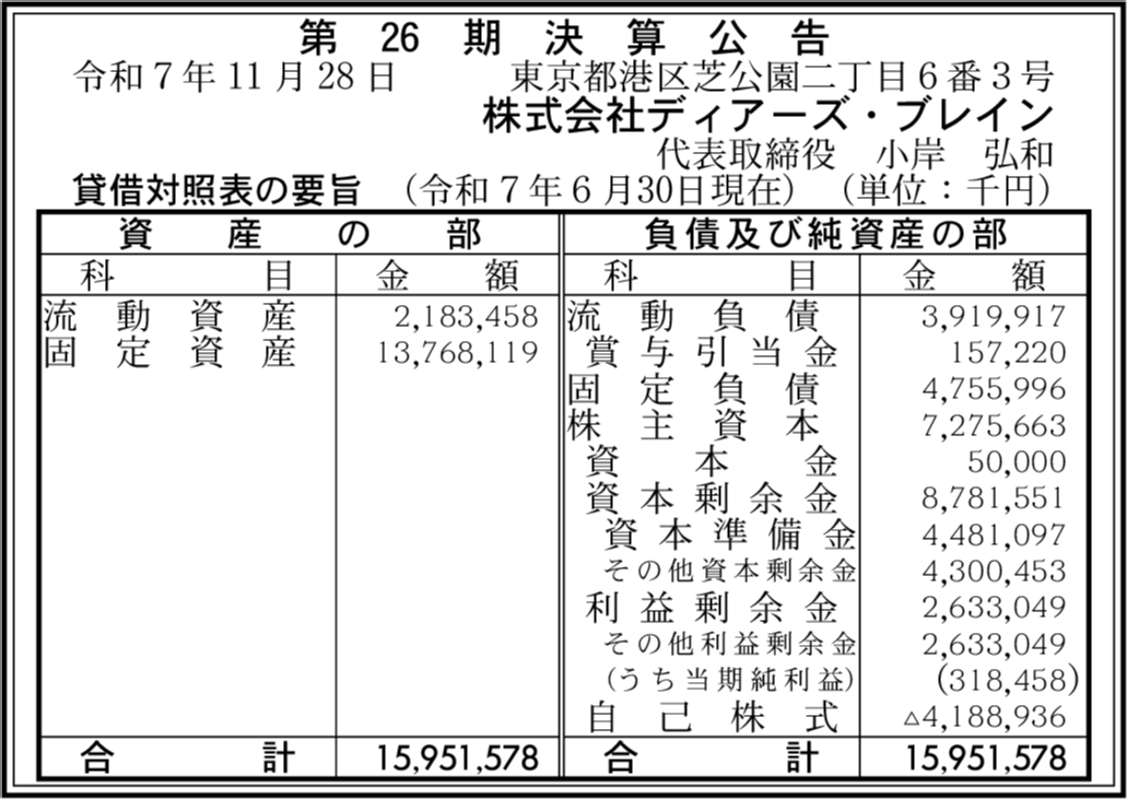 株式会社ディアーズ・ブレインホールディングス 東京都港区 【2025年6月期】 |