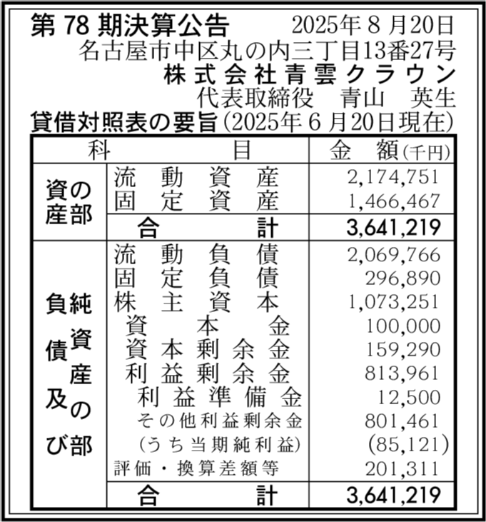 株式会社ロイヤル資産管理 名古屋市中区 【2025年8月期】 |