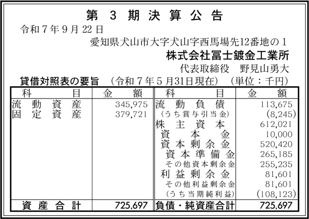株式会社冨士鍍金工業所閉鎖済み 愛知県犬山市 【2022年5月期】 |
