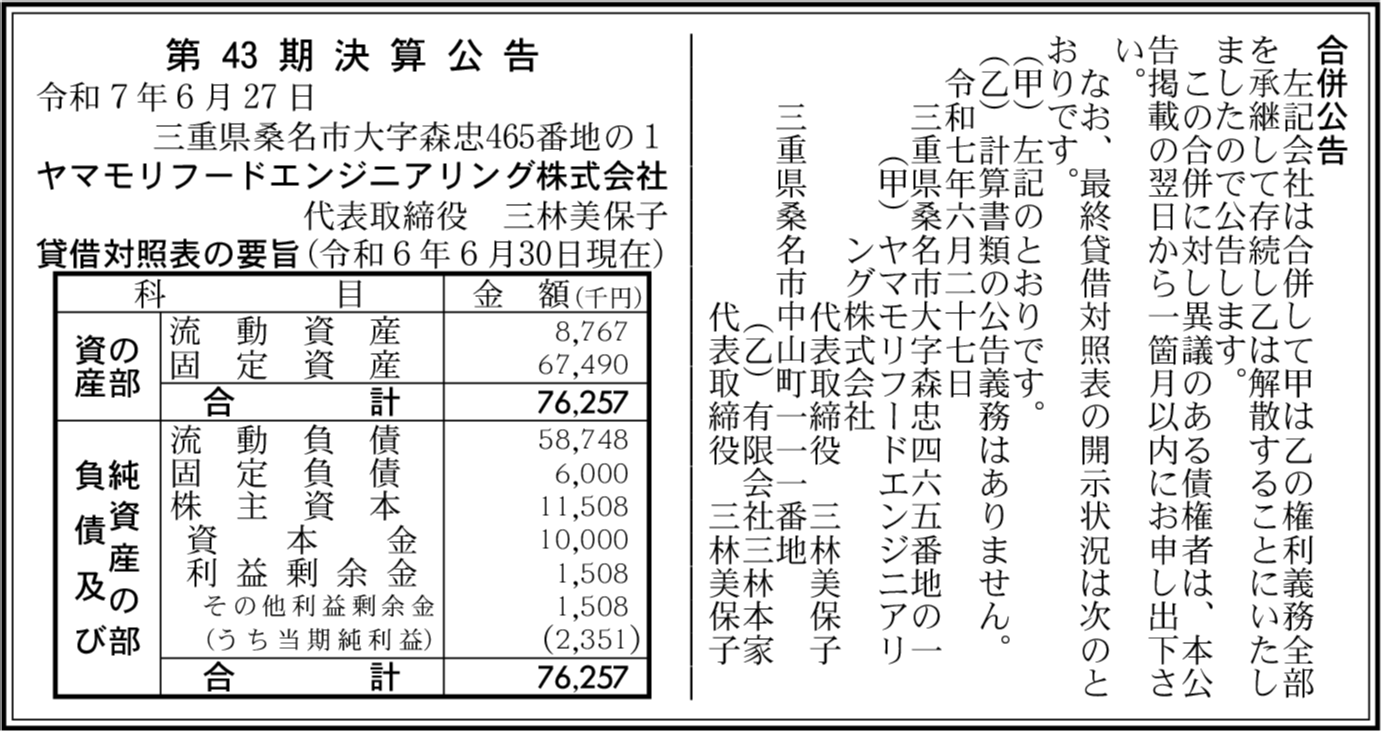 会社名 | ヤマモリフードエンジニアリング株式会社 |