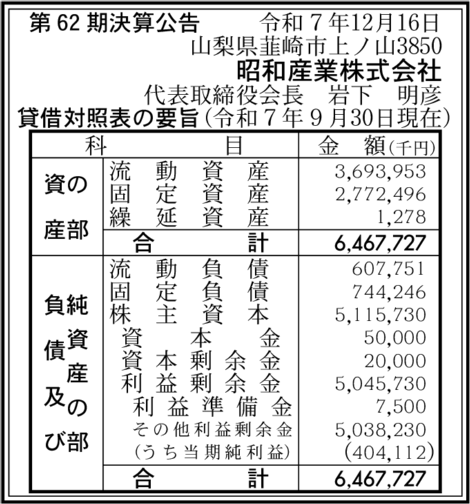 韮崎興産株式会社 山梨県韮崎市 【2025年3月期】 |