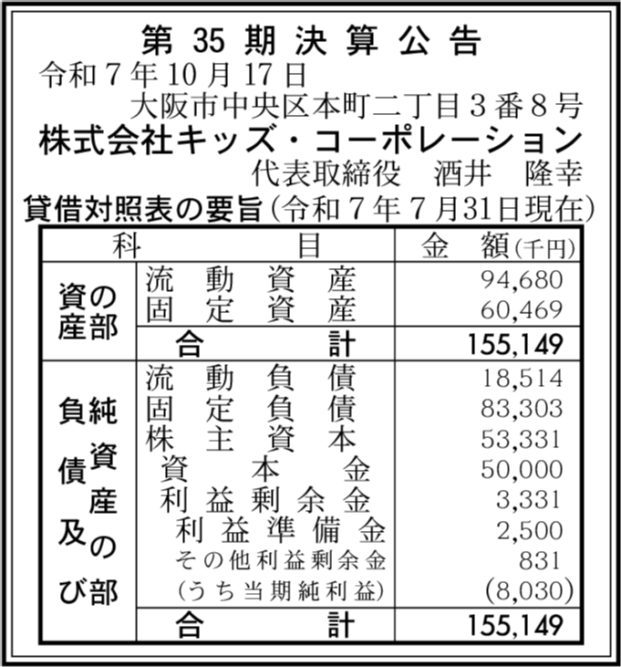 株式会社キッズインテグレーション 大阪市中央区 【2025年7月期】 |