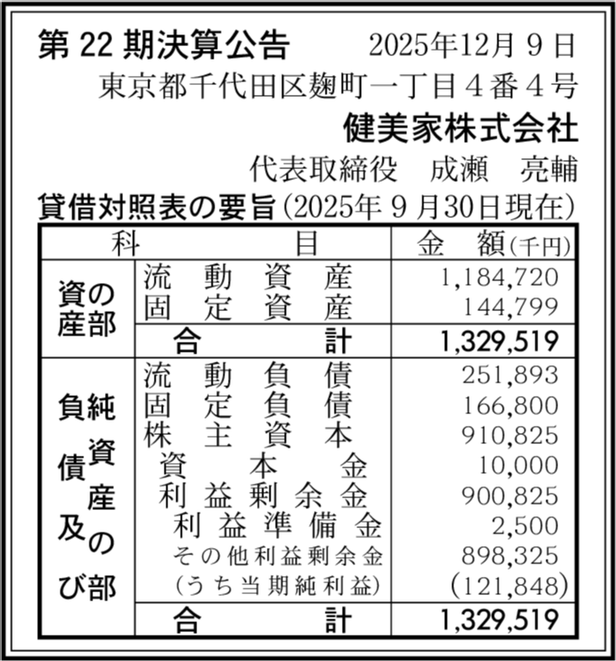 株式会社LIFULL Investment 東京都千代田区 【2025年9月期】 |