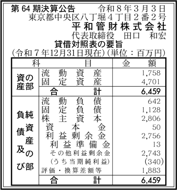 | 総資産 | 64億5,900万円 (▲17.52%) |