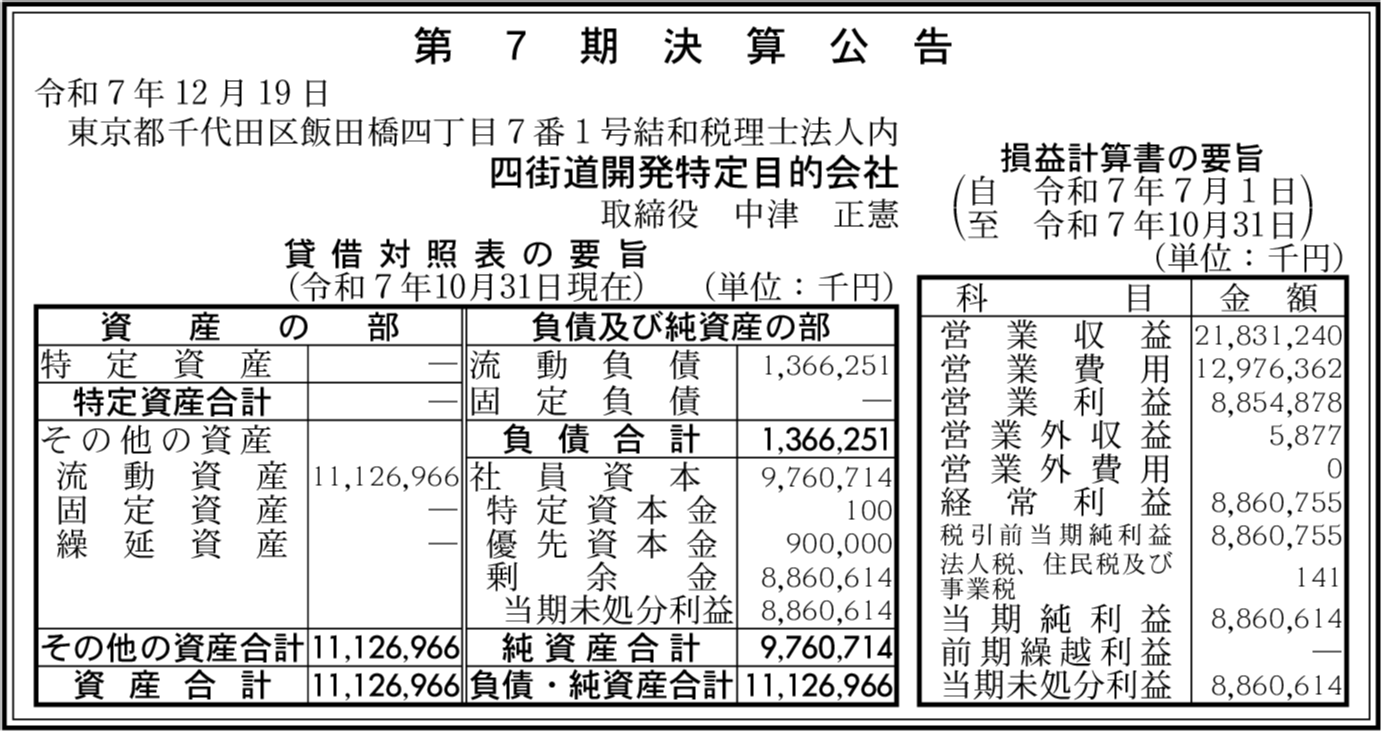 川西石道特定目的会社 東京都千代田区 【2025年10月期】 |