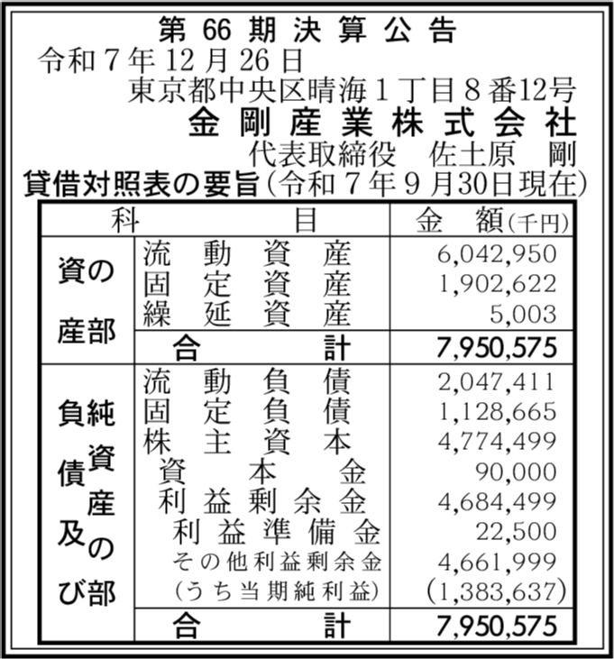 | 総資産 | 79億5,057万5,000円 (▲3.41%) |