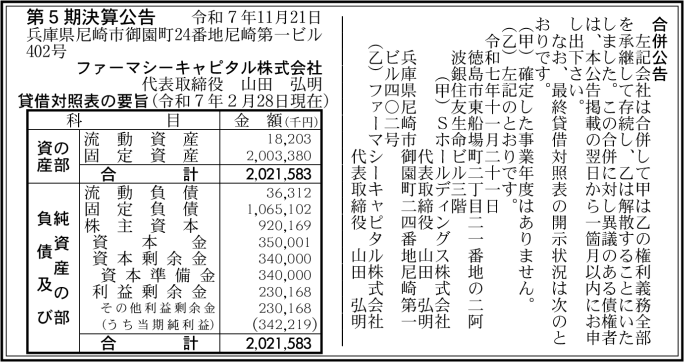 | 会社名 | ファーマシーキャピタル株式会社 |