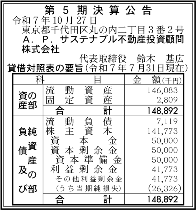 A.P.サステナブル不動産投資顧問株式会社 東京都千代田区 |