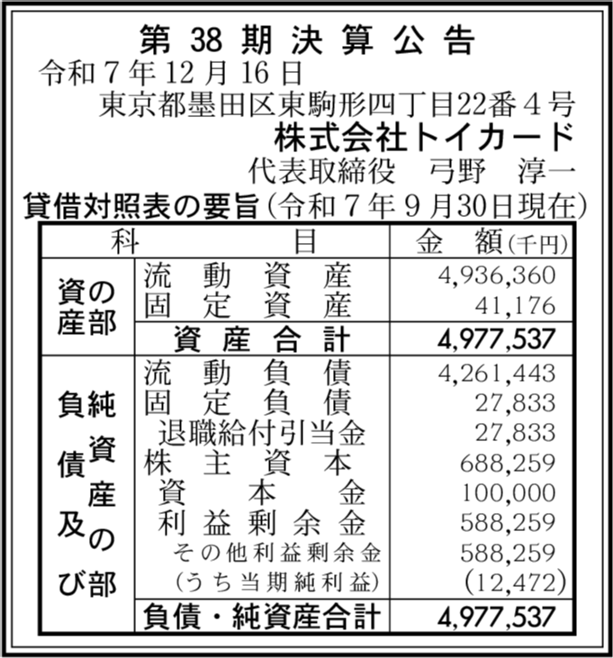 | 総資産 | 49億7,753万7,000円 (▲4.7%) |