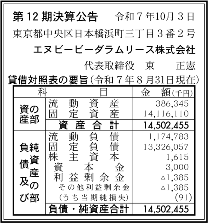 エヌビービーハリファクスリース株式会社 東京都中央区 【2025年8月期】 |