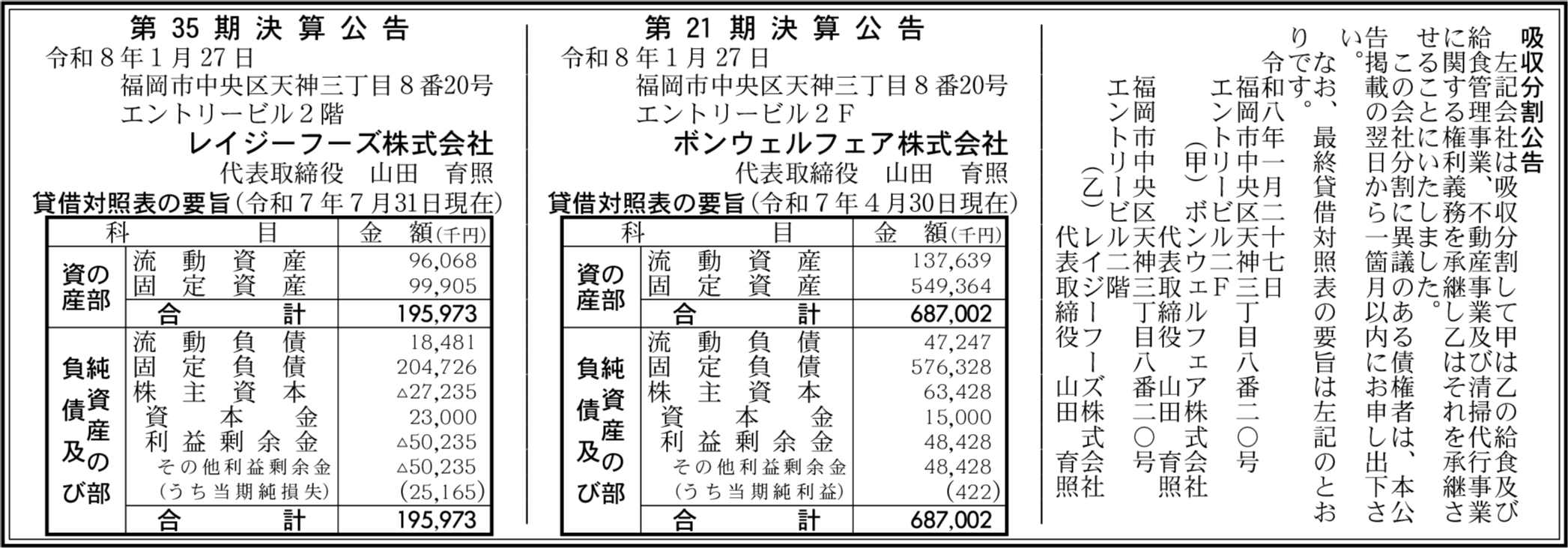 レイジーフーズ株式会社 福岡市中央区 【2025年7月期】 |