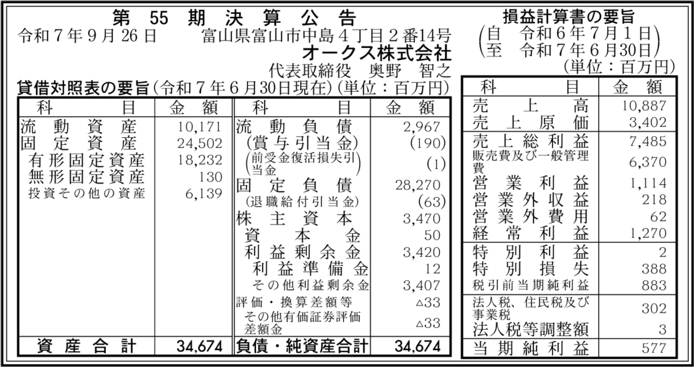オークスサービス株式会社閉鎖済み 富山県富山市 【2022年6月期】 |