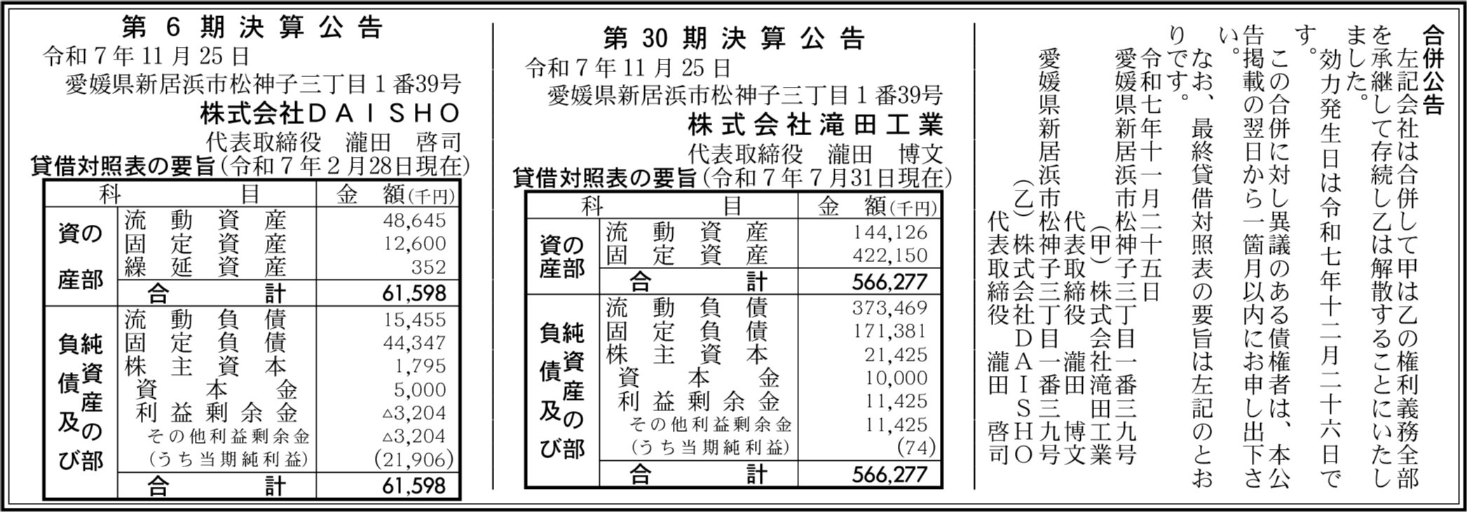 株式会社滝田工業 愛媛県新居浜市 【2025年7月期】 |