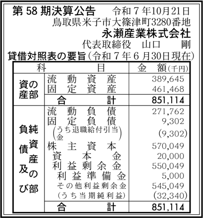 永瀬石油株式会社閉鎖済み 鳥取県米子市 【2025年3月期】 |