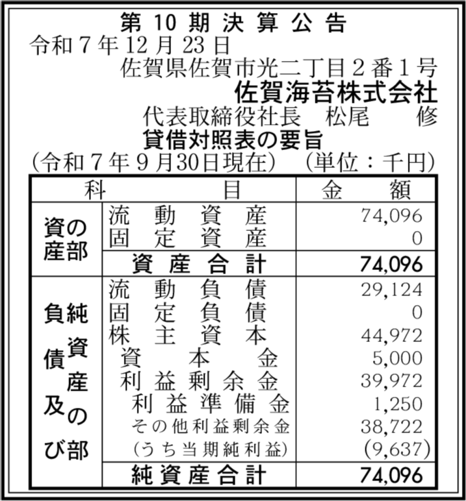 株式会社サン海苔 佐賀県佐賀市 【2025年9月期】 |