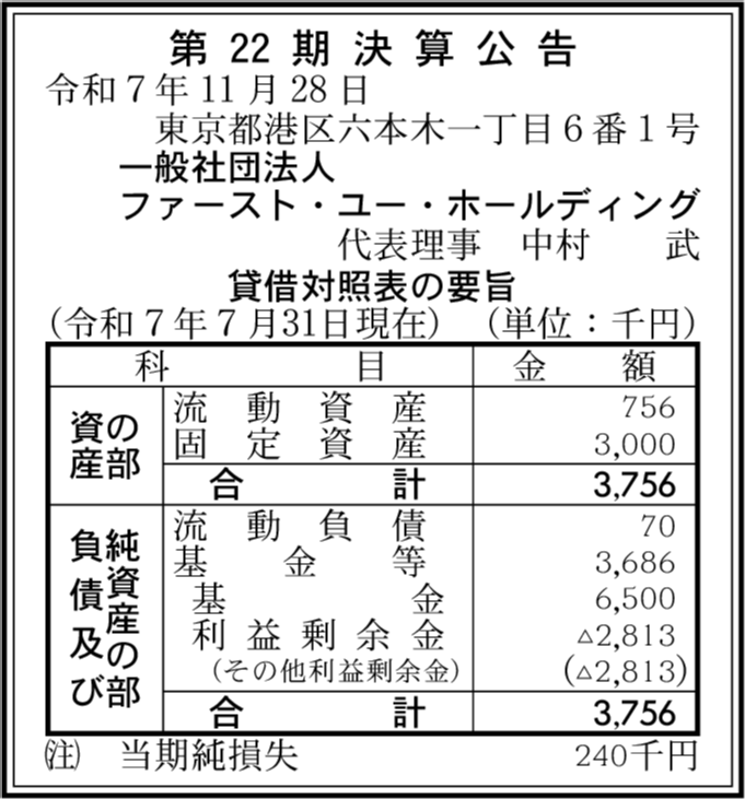 | 会社名 | 一般社団法人ファースト・ユー・ホールディング |
