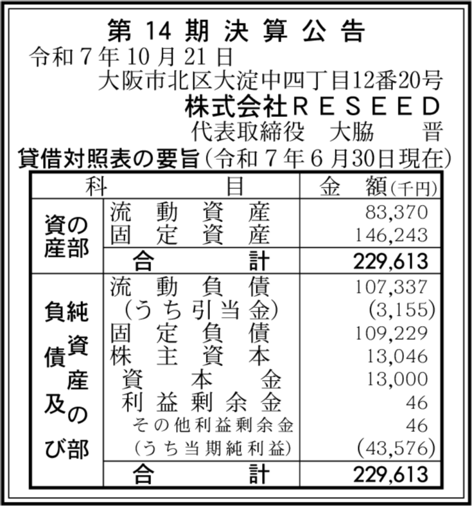 株式会社RESEED閉鎖済み 大阪市北区 【2024年6月期】 |
