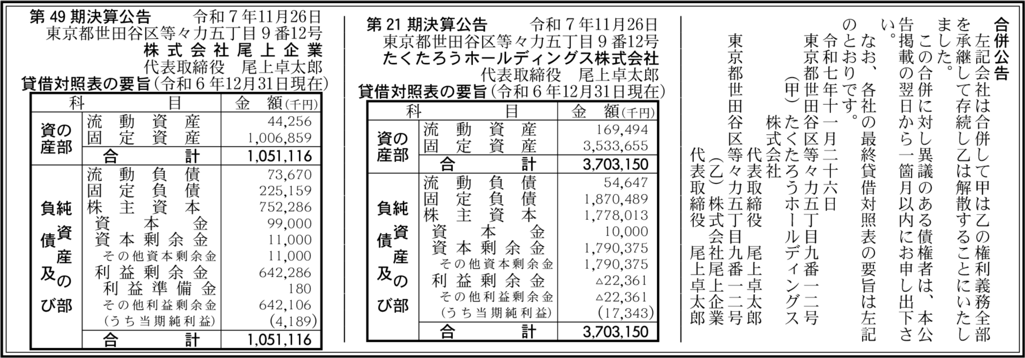 株式会社尾上企業 東京都世田谷区 【2024年12月期】 |