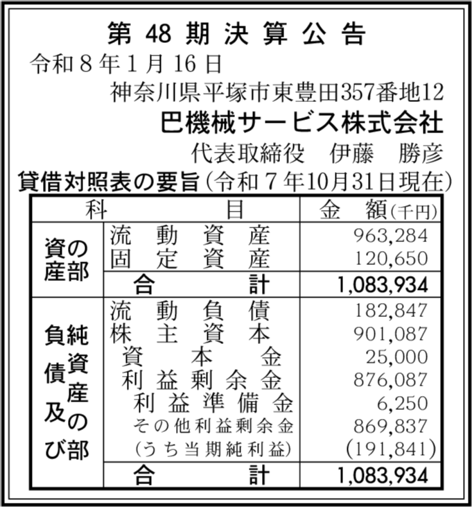 | 親会社・関連会社等 | 巴工業株式会社(4) |