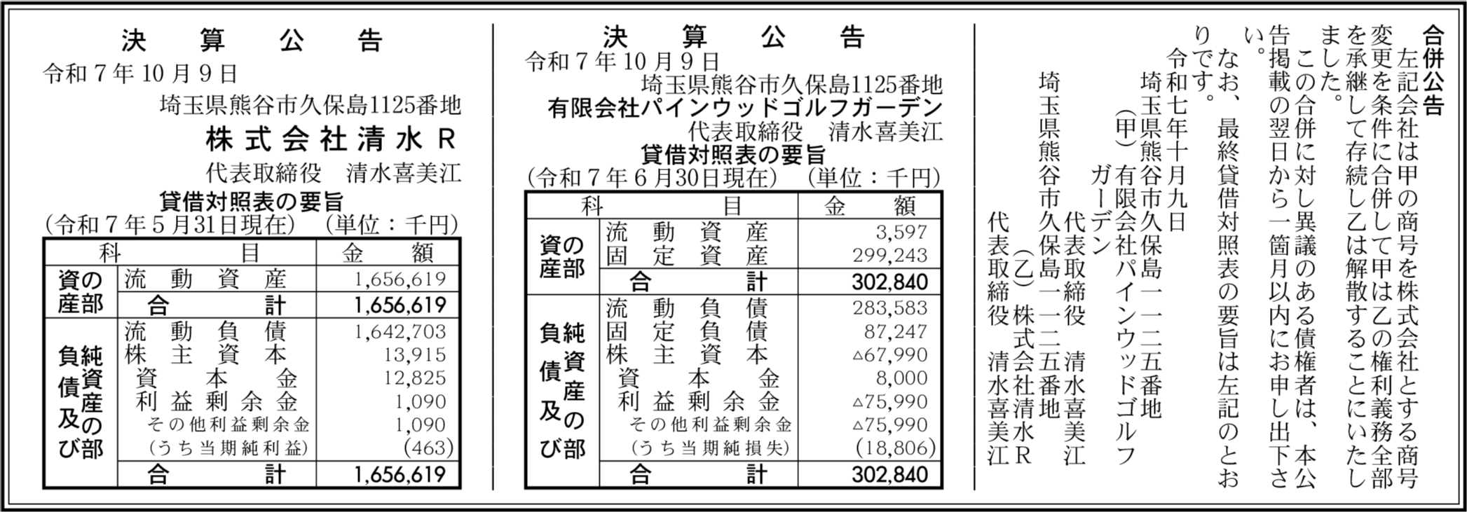 株式会社清水R 埼玉県熊谷市 【2025年5月期】 |