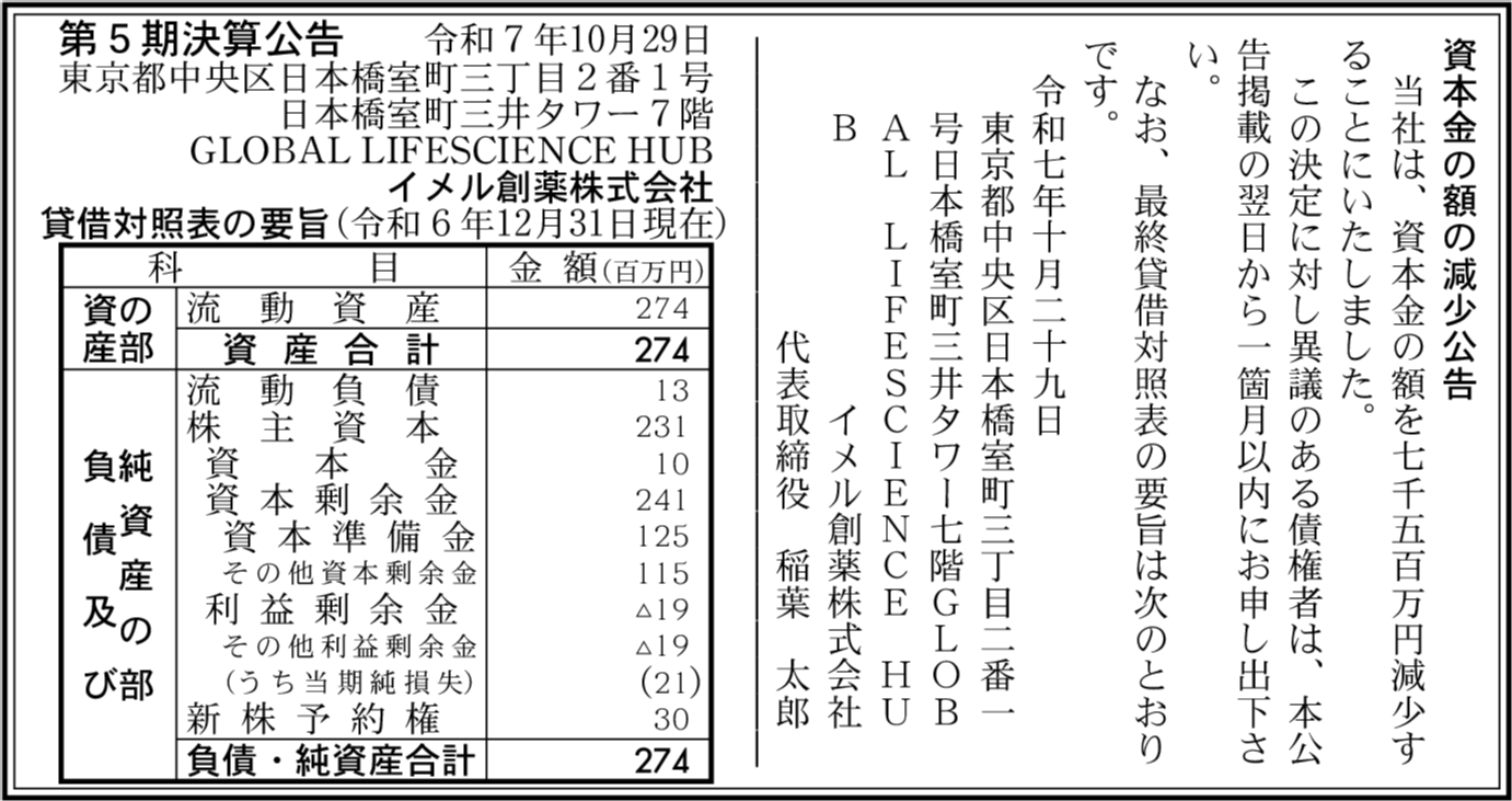 | 会社名 | イメル創薬株式会社 |