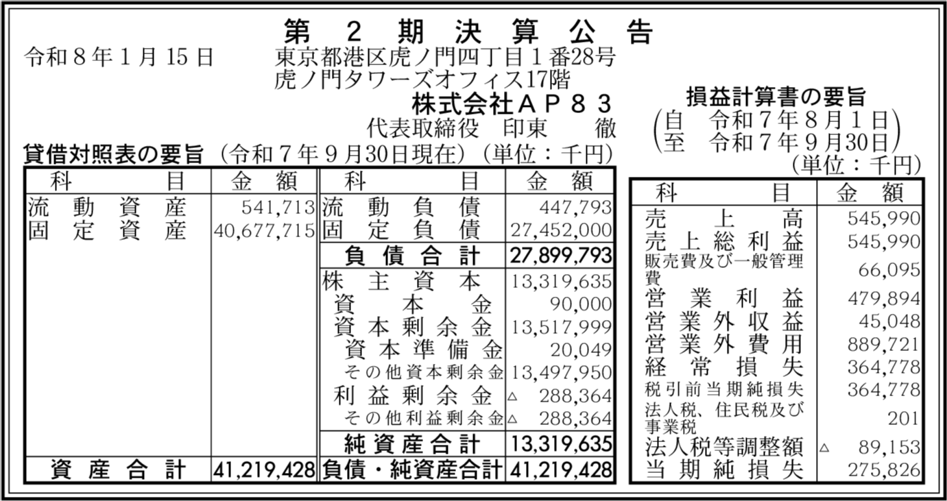 株式会社AP83ホールディングス 東京都港区 【2025年9月期】 |