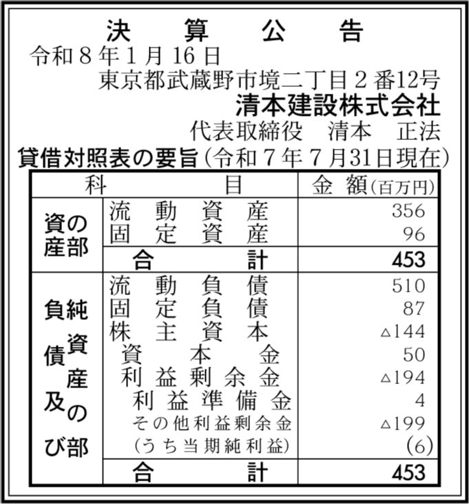 株式会社清本ビル 東京都武蔵野市 【2025年8月期】 |