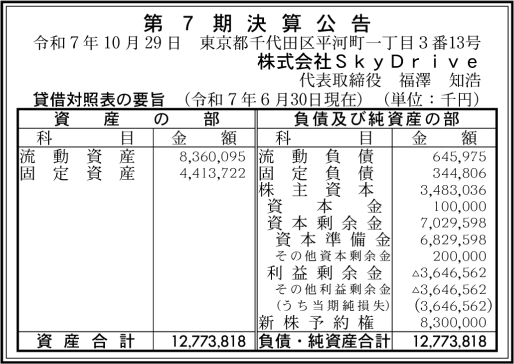 | 株式会社SkyDrive 東京都千代田区 | △36億4,656万2,000円 (赤字縮小) | △36億4,656万2,000円 (赤字縮小) | 127億7,381万8,000円 (+140.14%) |