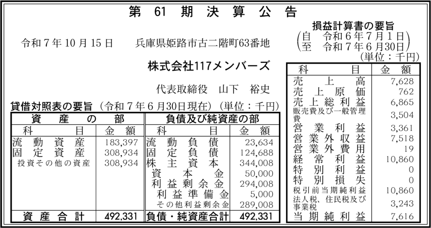 株式会社117 兵庫県姫路市 【2025年6月期】 |
