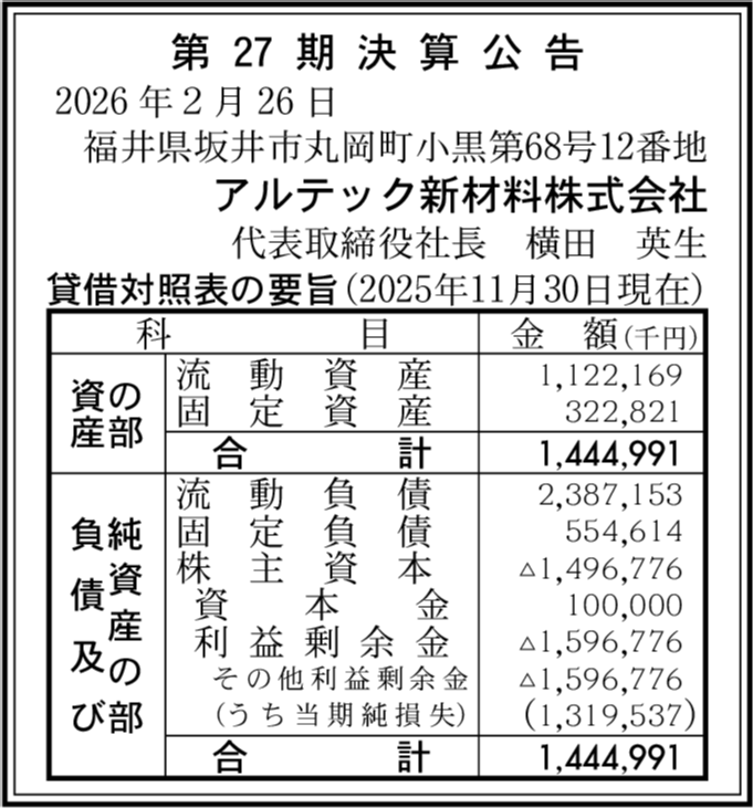 | 会社名 | アルテック新材料株式会社 |