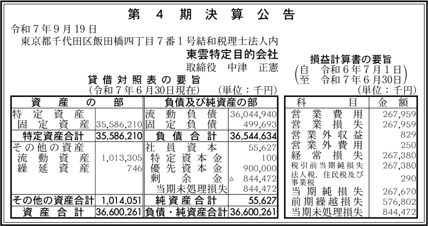 つくば中央特定目的会社 東京都千代田区 【2025年6月期】 |