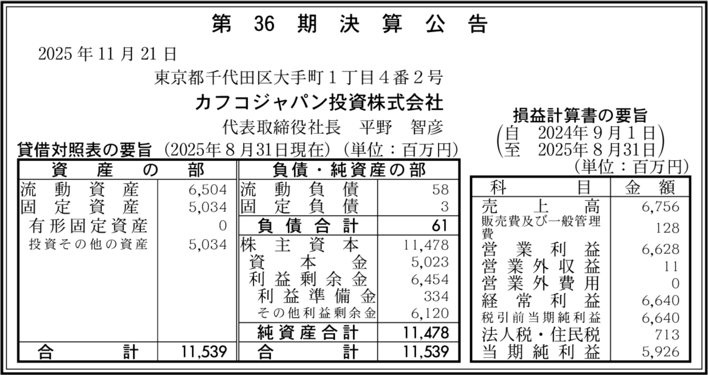 | 会社名 | カフコジャパン投資株式会社 |
