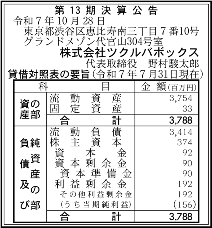 | 親会社・関連会社等 | 株式会社ツクルバ(1) |