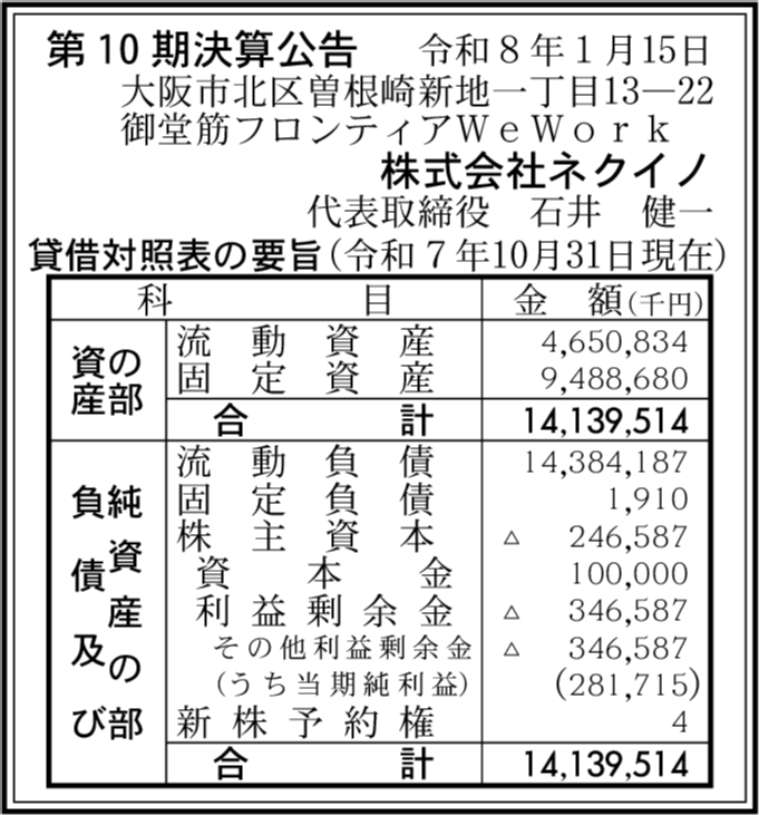 ネクイノメディカルテクノロジーズ株式会社閉鎖済み 大阪府大阪市北区 【2020年5月期】 |