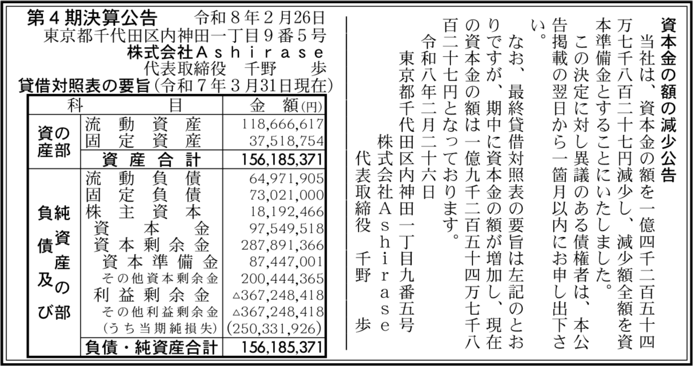 | 利益剰余金 | ▲3億6,724万8,418円 |