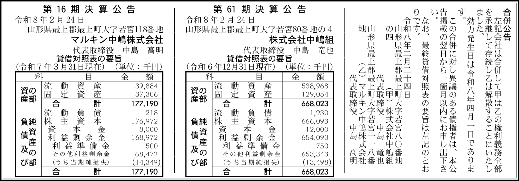 マルキン中嶋株式会社 山形県最上郡最上町 【2025年3月期】 |