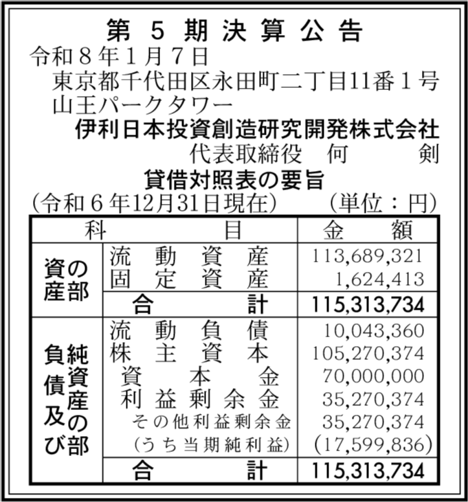 | 会社名 | 伊利日本投資創造研究開発株式会社 |