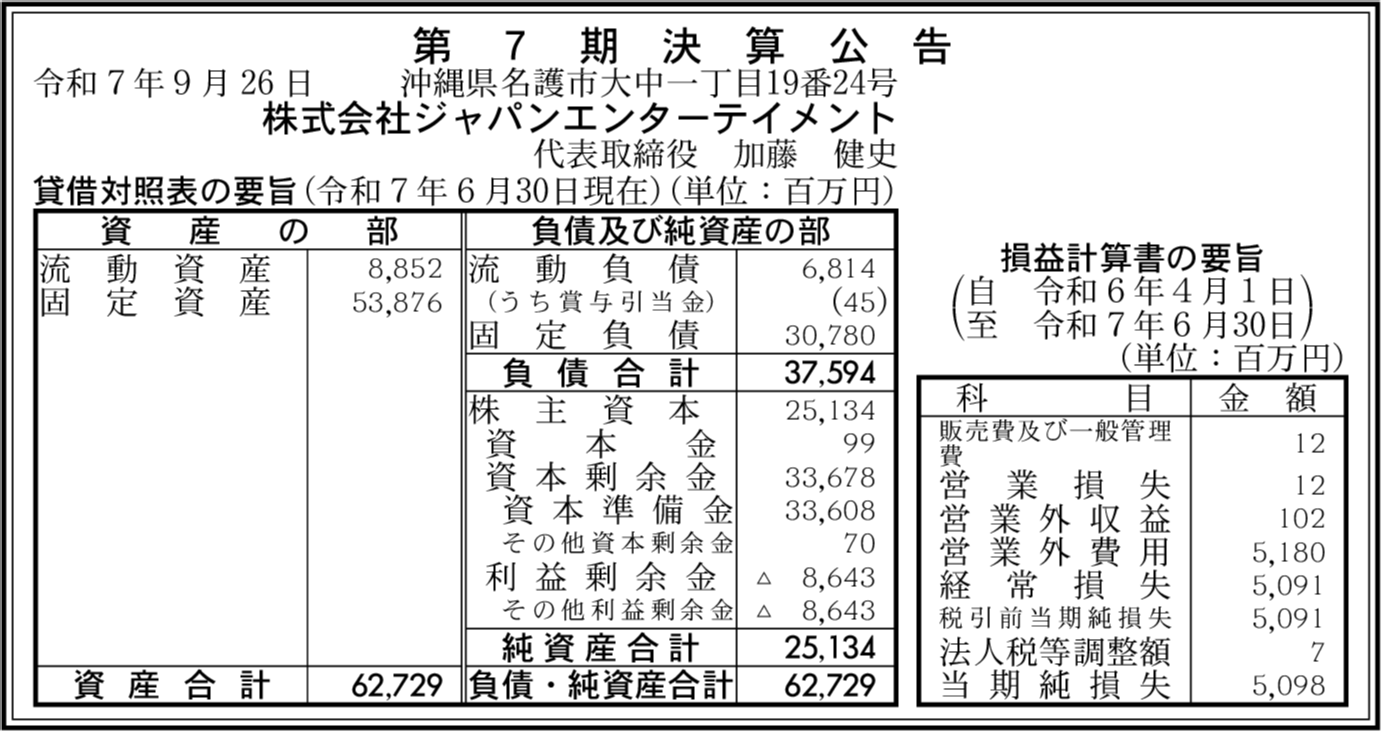 株式会社ジャパンエンターテイメントホールディングス 沖縄県名護市 【2025年6月期】 |