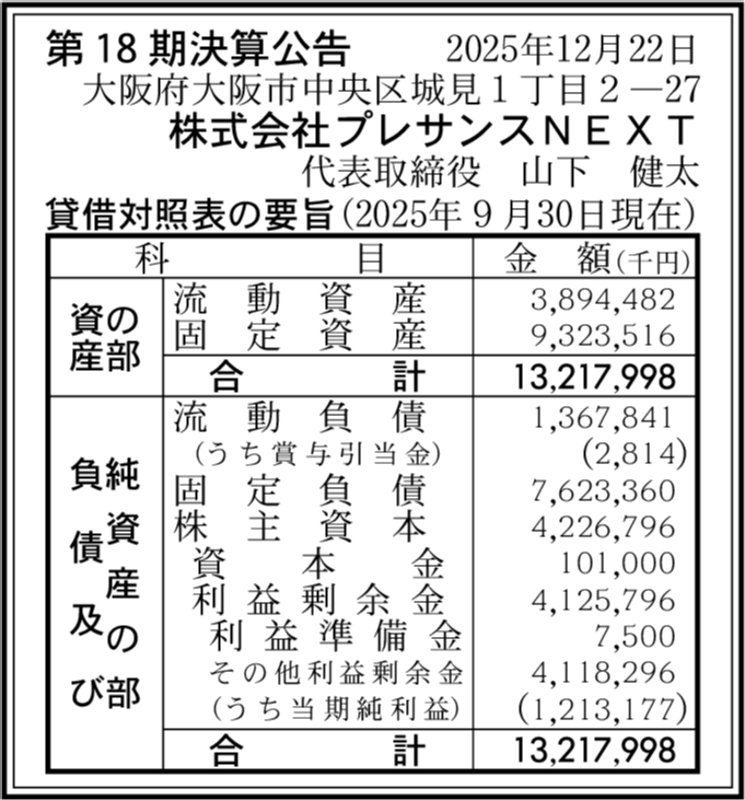 株式会社プレサンス住販 大阪府大阪市中央区 【2025年9月期】 |