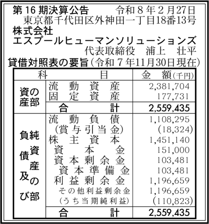 株式会社エスプールブリッジ 東京都千代田区 【2025年11月期】 |
