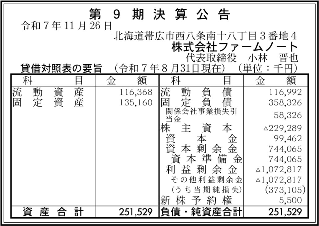 株式会社ファームノート閉鎖済み 北海道帯広市 【2024年8月期】 |