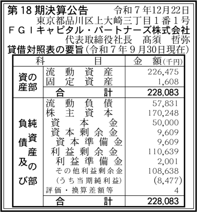 | 会社名 | FGIキャピタル・パートナーズ株式会社 |