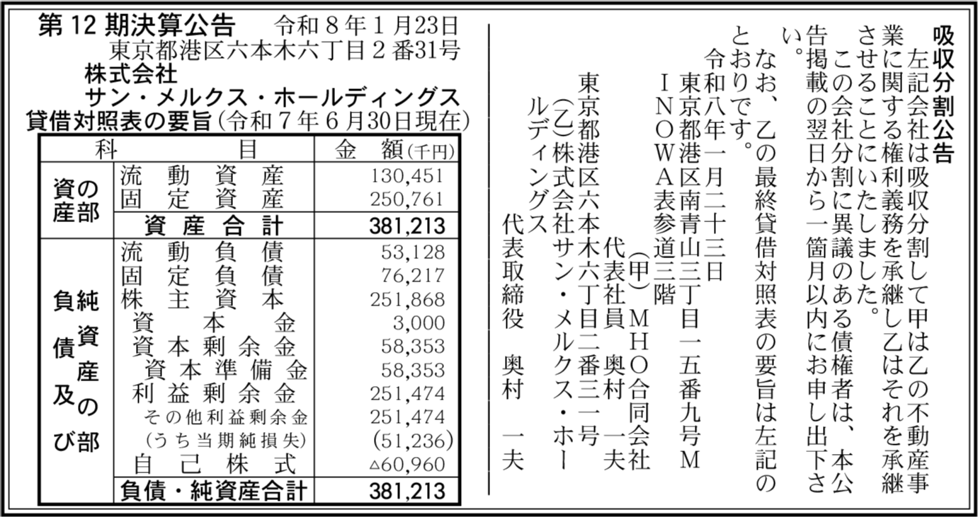 | 会社名 | 株式会社サン・メルクス・ホールディングス |