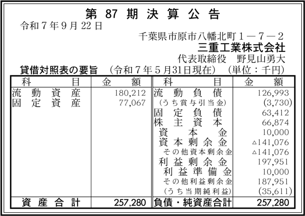三重工業株式会社 | 千葉県市原市 | △500万円 |
