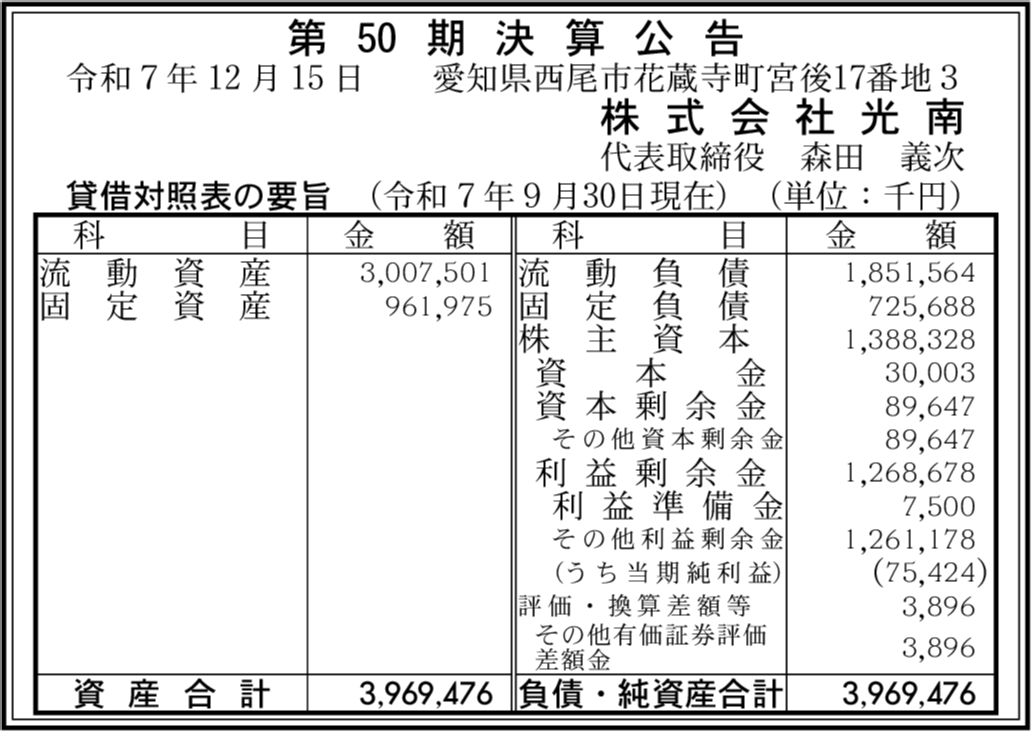 | 利益剰余金 | 12億6,867万8,000円 (▲8.66%) |