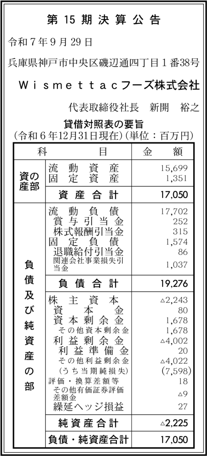 Wismettacフーズ株式会社 | 東京都中央区 | 2億2,100万円 |